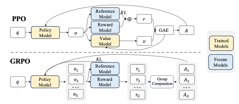 举个现实生活中的例子方便大家理解:现在有一所学校,策略模型是学生,负责在卷子上填写答案;奖励模型是自动阅卷系统,负责自动阅卷并评分;价值模型是老师,负责综合评估总体状况并给出指导反馈。现在,我们让学生们互相讨论并比较他们之间的作业,让他们互相学习。学生以这种模式在没有老师(也就是价值模型)的条件下依然能够充分互相发现优缺点并学习改进,并且由于不再需要雇用老师,学校还能减少经费开销(也就是所需硬件资源减少)。