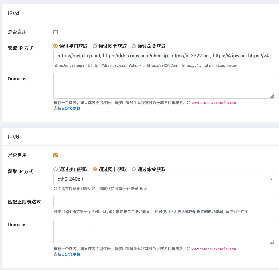 在下方 IPv4 和 IPv6 的选项中勾选需要解析的 IP 类别,并在 Domains 中填写需要解析到的目标域名。