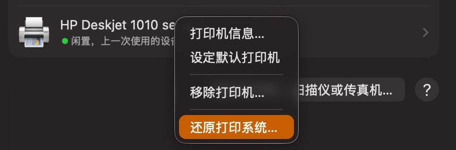 首先检查你的设置,移除已经有的打印机配置。前往系统设置 → 打印机与扫描仪,右键选择还原打印系统...。