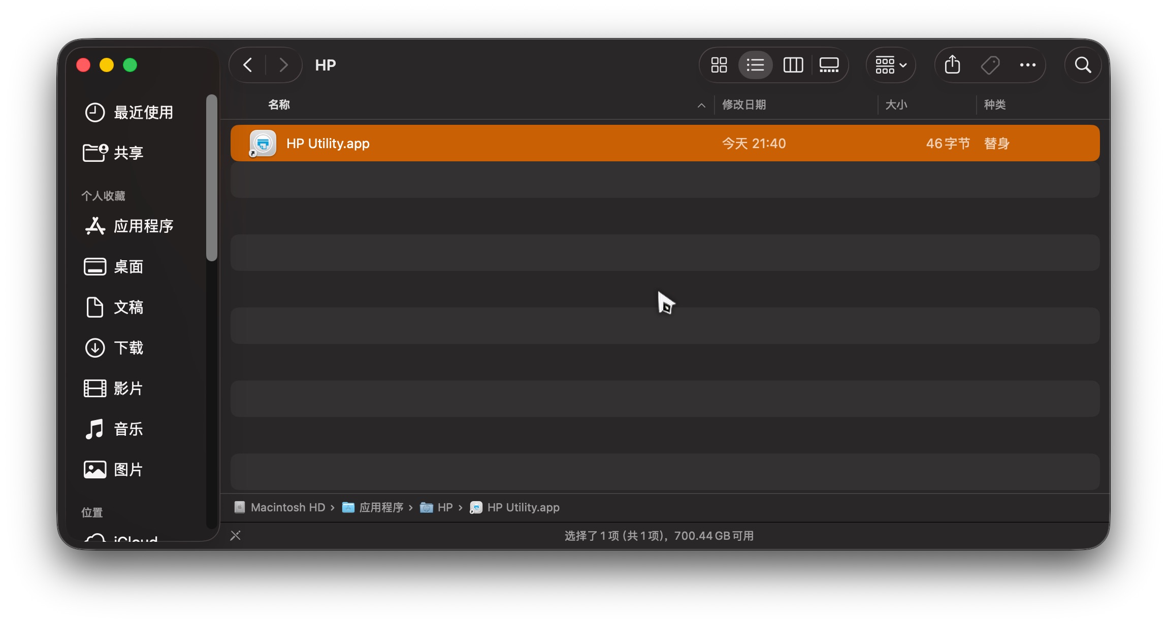 接下来,多亏了弱智苹果在 Tahoe 系统中把启动台砍没了,你现在看不到新装上的 HP 驱动,App 列表里也不会显示。请打开访达 → 应用程序,找到 HP 文件夹,里面会有一个HP Utility.app的替身: