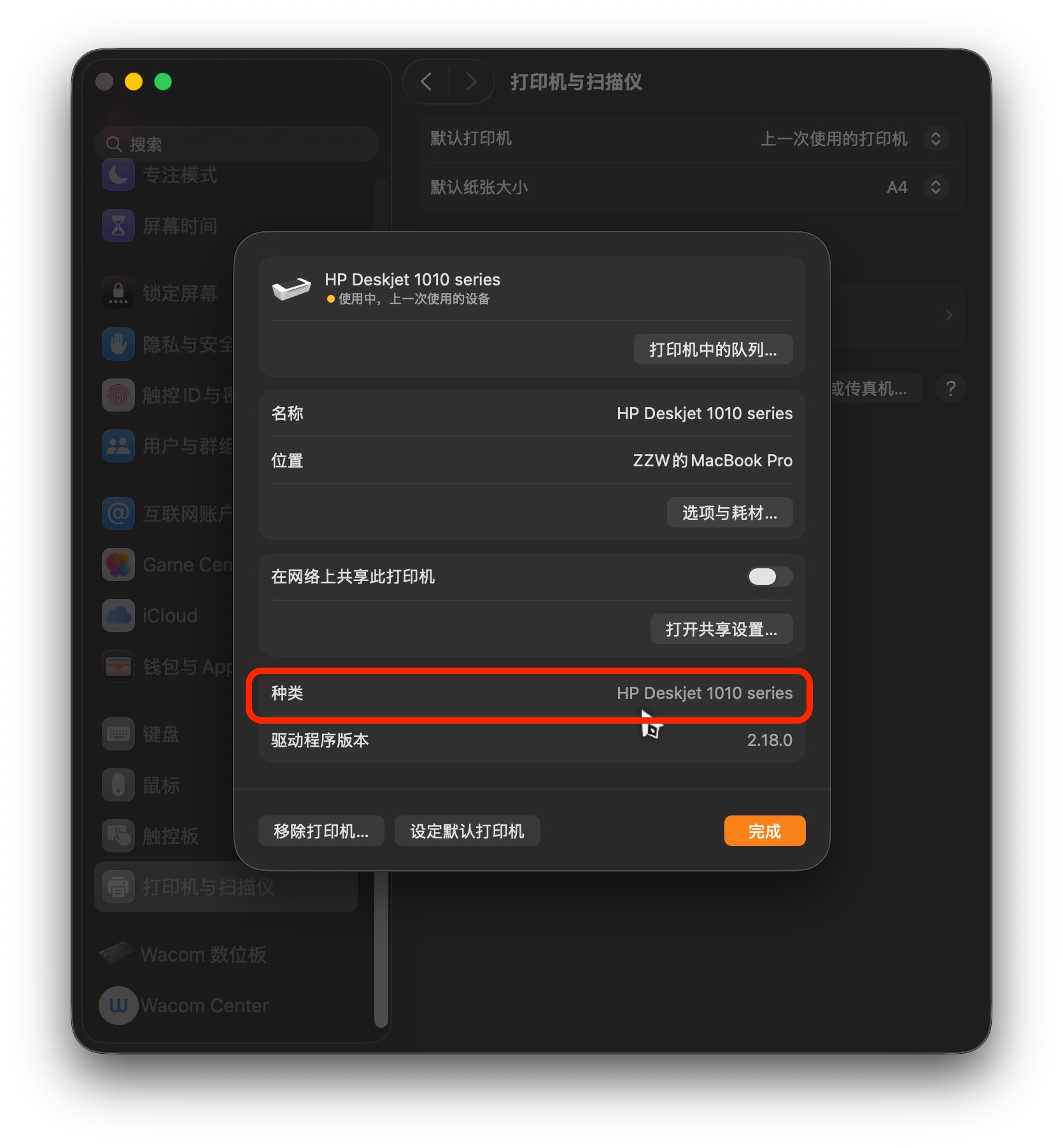 接下来,回到系统设置 → 打印机与扫描仪,看到打印机的图标是 1010 的图片,而不是一个通用的 logo,就说明成功了: