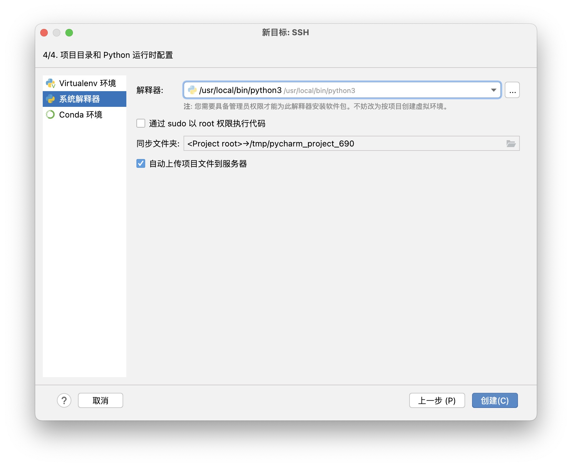 在运行时配置中选择系统解释器,将路径指向容器内 python 安装目录即可。