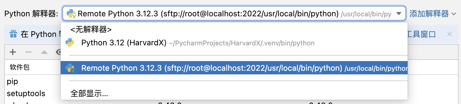 至此,配置已经完成,在解释器设置内选择刚配置完成的 Remote Python 即可。
