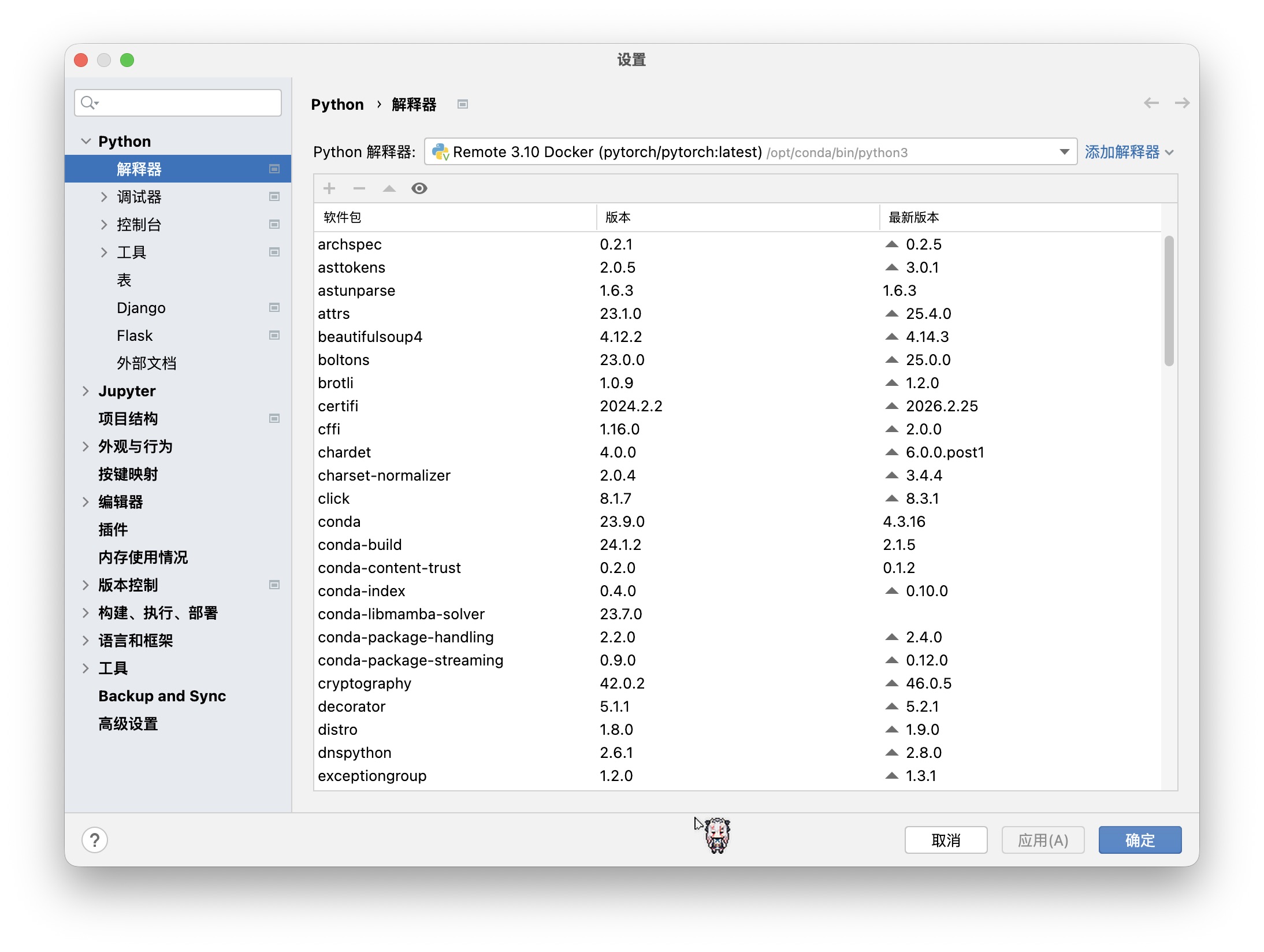 如你所见,现在 PyCharm 检测出了容器内的所有依赖,可以进行自动补全了。