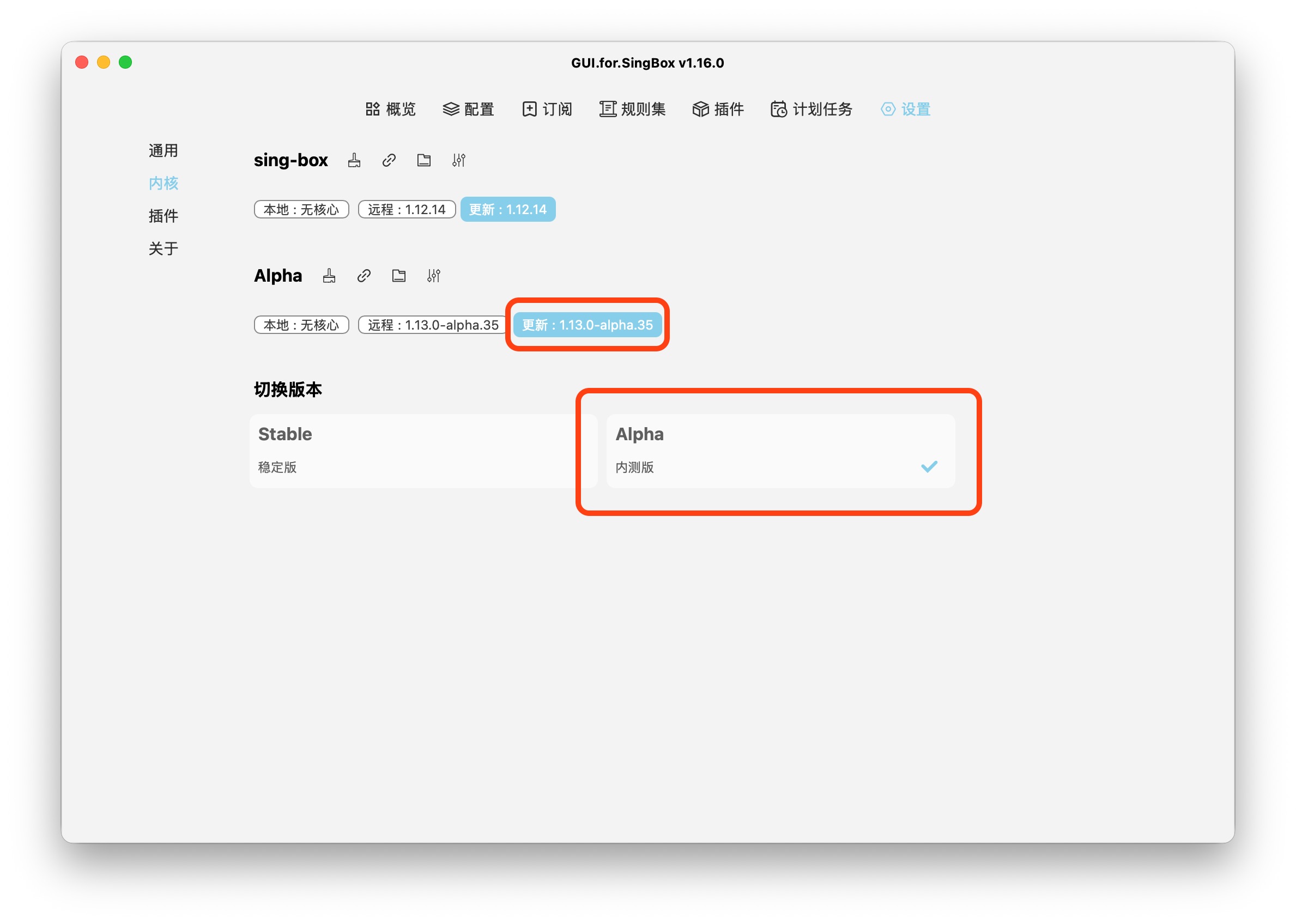 打开 GUI.for.SingBox,设置 → 内核 → 选择更新 alpha 内核 → 切换版本至 alpha 内测版内核: