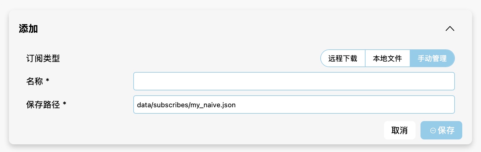 在 GUI 中导航到订阅 → 添加,在弹窗中选择手动管理,并填入保存的 json 的路径: