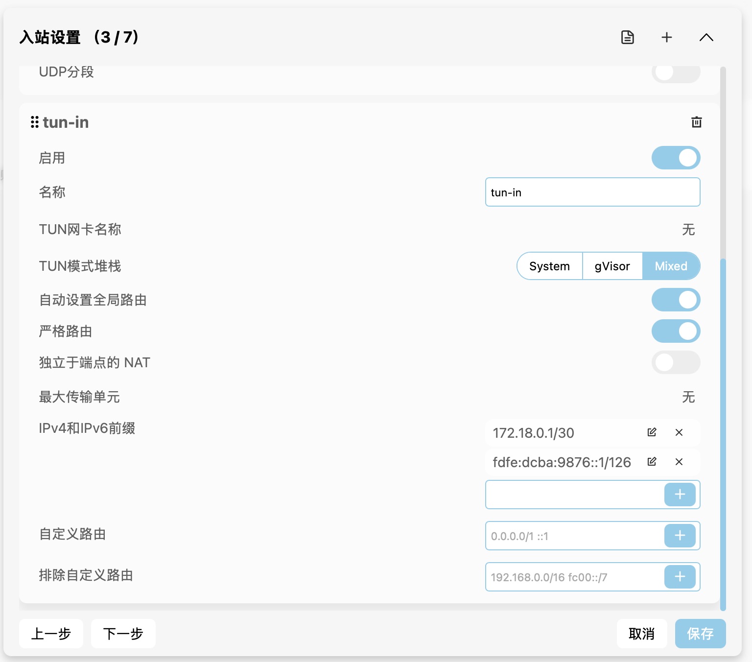 在入站设置中添加一个tun-in的入站模式并启用,将TUN模式堆栈改为Mixed,启用自动设置全局路由和严格路由: