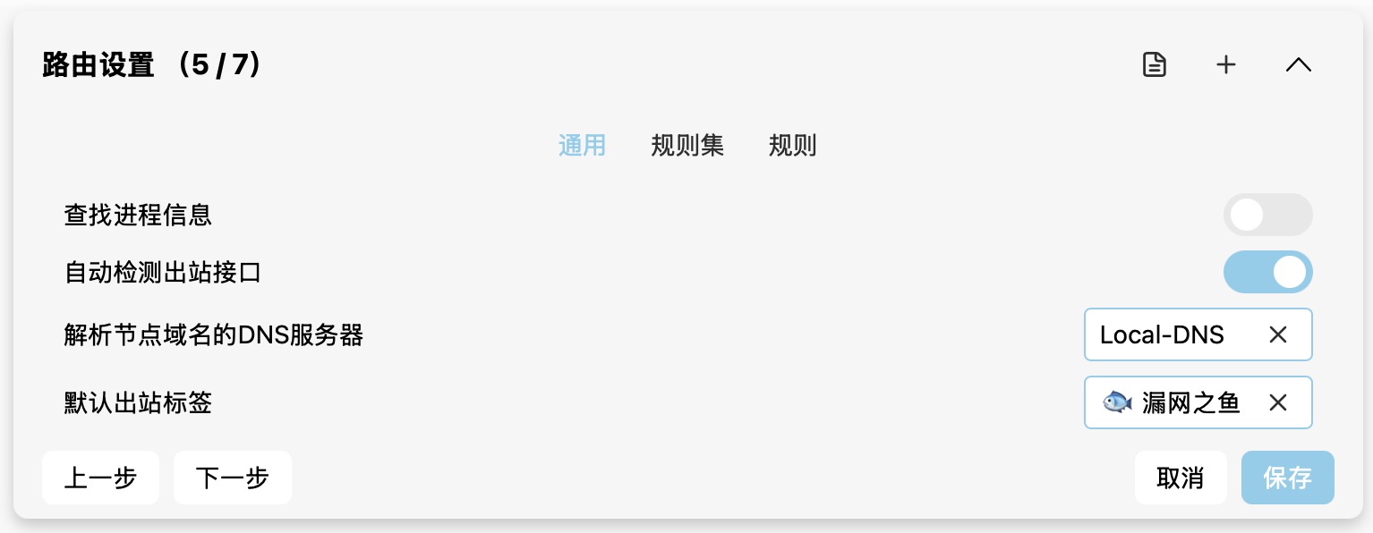 在路由设置中,选择Local-DNS作为解析节点域名的DNS服务器,默认出站标签选择漏网之鱼:
