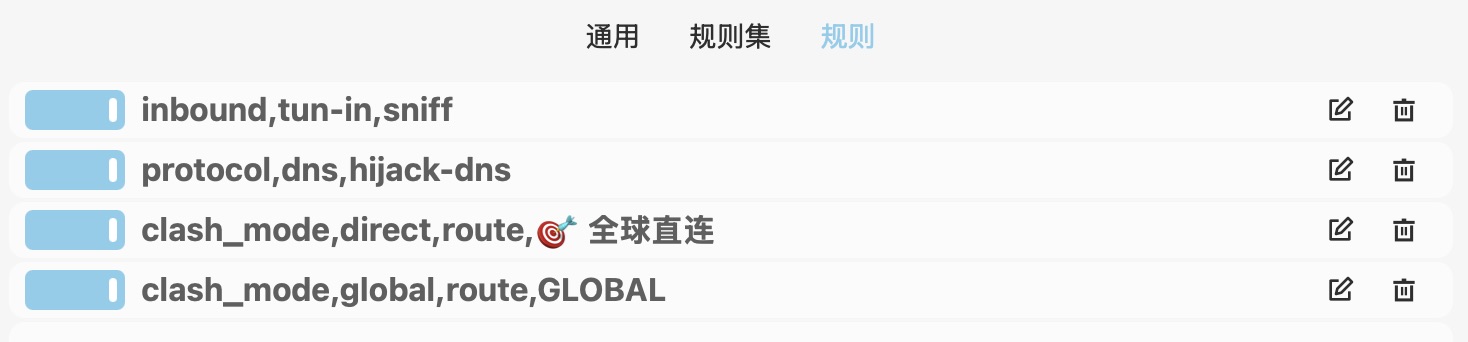 至于规则集和规则使用默认配置即可,无须修改,只需要确保规则里拥有并启用了以下四条: