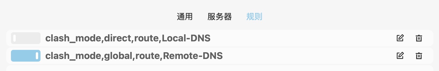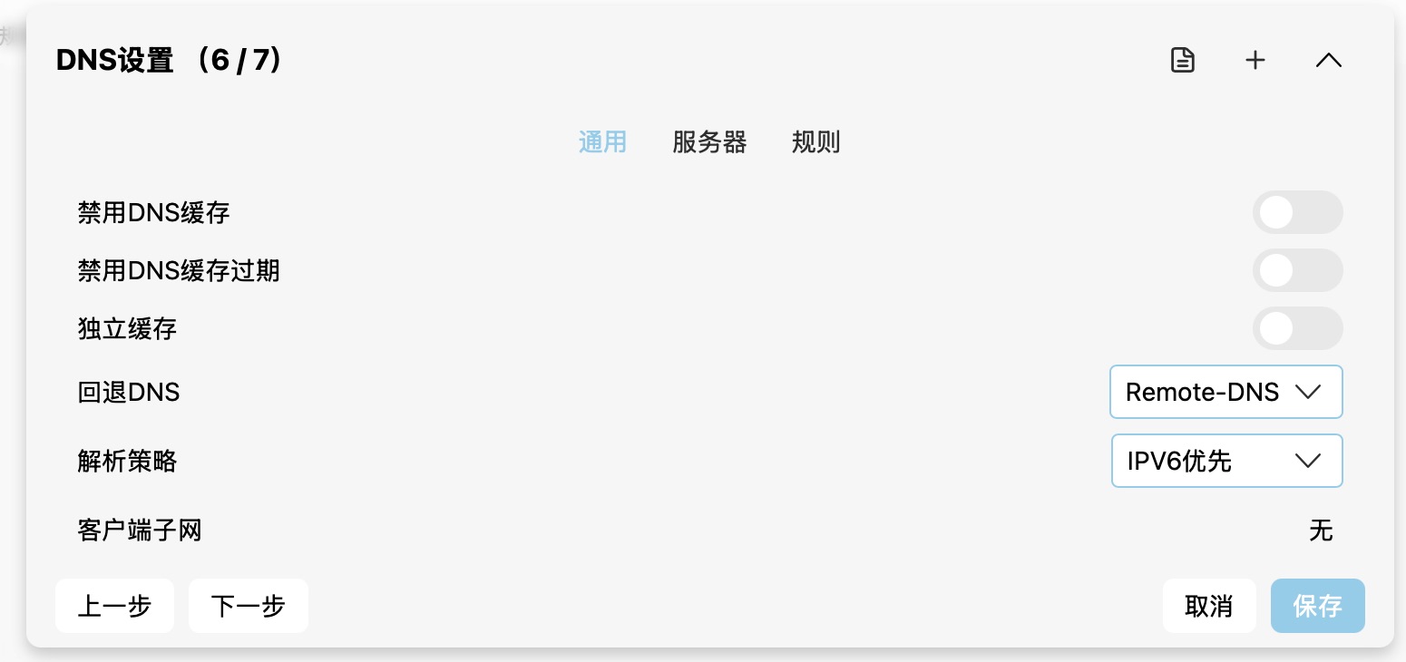 在 DNS 设置中,我这里使用的是双栈服务器,所以解析策略使用了IPV6优先,请根据你的网络环境进行选择。同时为了防止 DNS 泄露,将回退DNS 设置为 Remote-DNS,且因我们本来就要全局代理,所以一并在规则中关闭 clash_mode,direct,route,Local-DNS: